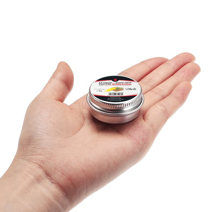 La latta contiene 5 Gr. di Polvere di peperoncino Aji Lemon